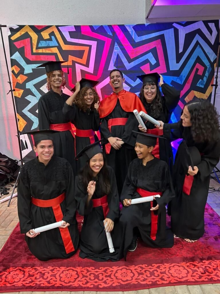 Por fim, ao reunir todas essas experiências – acadêmicas, práticas e reflexivas – percebo que fui capaz de evoluir diariamente em sala de aula. Recentemente, tive a satisfação de participar da formatura da minha primeira turma, e os resultados obtidos foram surpreendentes. Os alunos demonstraram um domínio da Língua Inglesa superior ao esperado, alcançando, de forma coletiva, o nível intermediário, conforme estabelecido como objetivo principal. O trabalho final consistiu em uma apresentação totalmente em inglês sobre países falantes da língua, como Nigéria, Jamaica e Bahamas, e foi conduzido com desenvoltura e competência pelos estudantes.